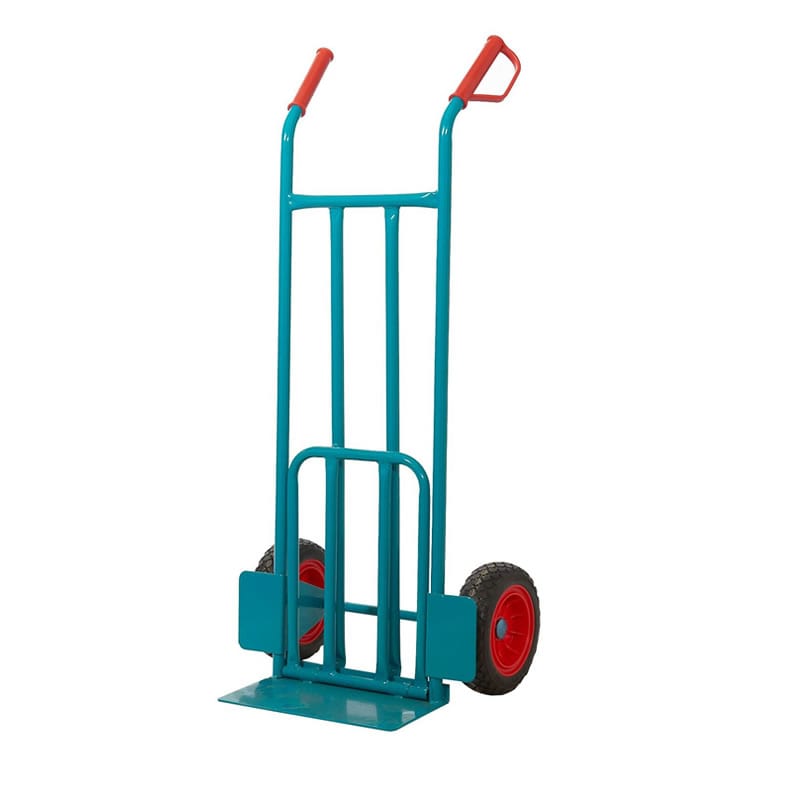 Heavy duty sack truck made of high quality steel with a hardwearing powder coated finish and knuckle guard hand grips. Sack barrow with fixed and longer folding toe plates to provide greater lifting purchase when transporting heavier or bulky items.