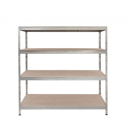 Economical and adjustable shelving with quick and easy boltless construction using galvanised metal components that lock together and drop-in high density fibreboard shelves. Simple and robust system with wide shelfspan for domestic and commercial environments.